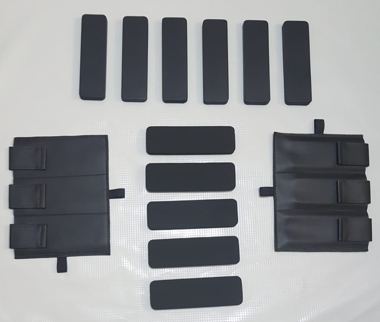 Barras de Borracha EVA para ajusta a carga do colete, assim variando os pesos de 1,5 kilos até a carga máxima das barras no total 9 kilos, para masculino e 6 kilos para feminino, mais 650 gramas do colete OGRUS.